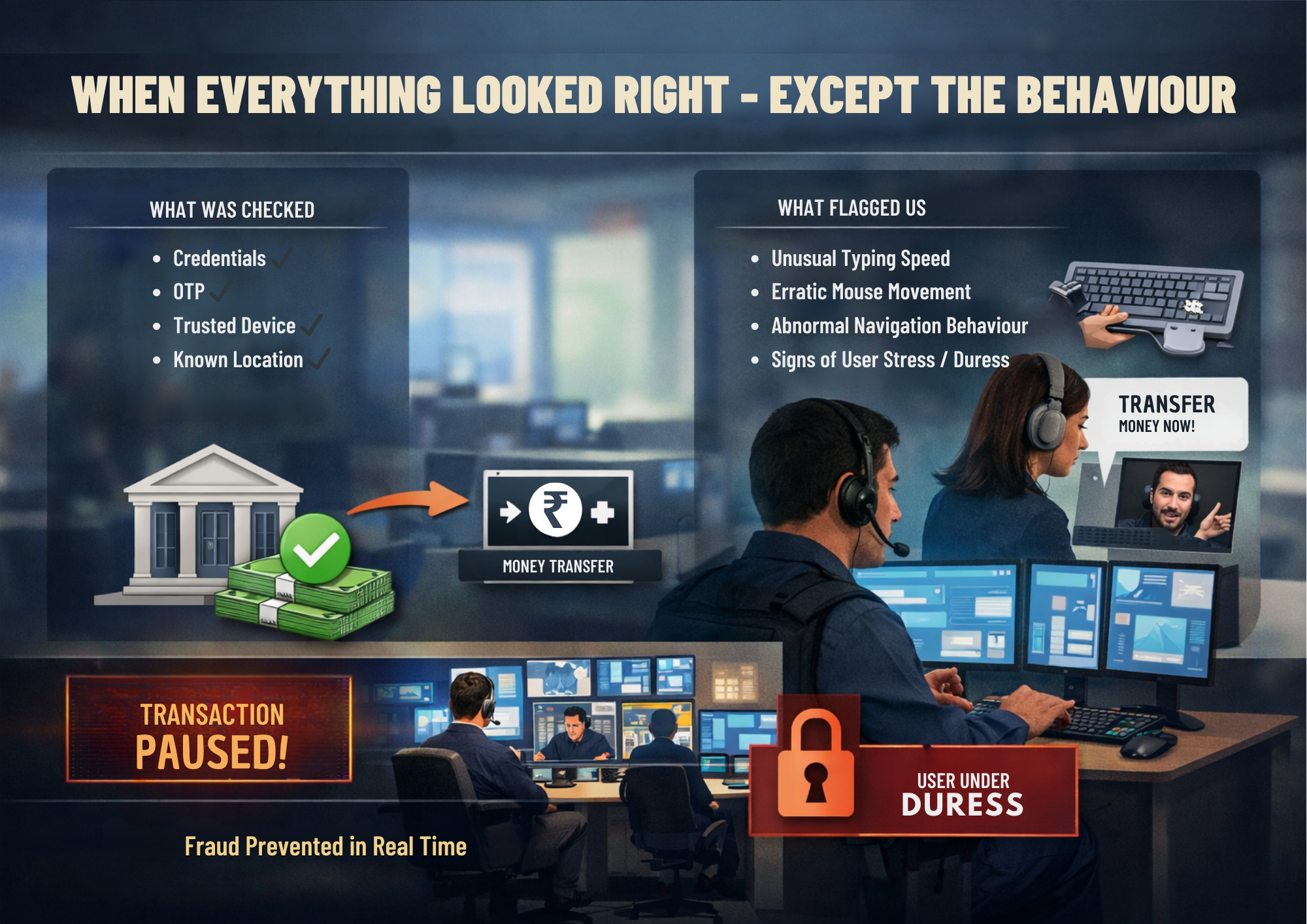 But behaviour told a different story. Tira paused longer than usual. Her typing became uneven. She deleted and re-entered information. She was on a phone call — pressured, rushed, manipulated. The system introduced a contextual pause. The transfer was held. The call ended. The fraud was stopped. The login was legitimate. The behaviour was not.