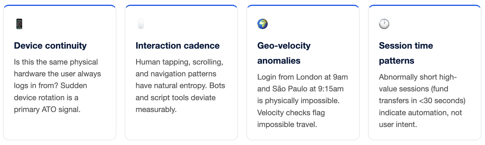 Behavioural AI doesn't replace device intelligence — it amplifies it. At Sign3.ai, our platform fuses device-level signals (hardware attestation, emulator detection, GPS spoofing flags) with session-level behavioural features to build a composite risk score that evolves through a user's journey, not just at login.