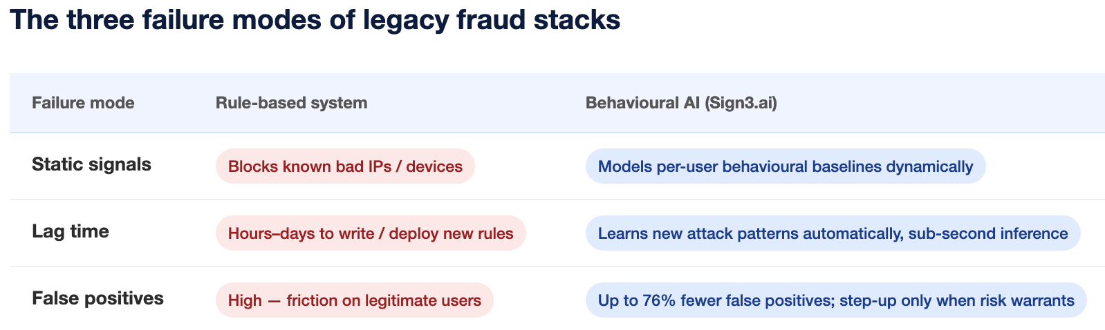 "Rule-based fraud systems flag what attackers did yesterday. Behavioural AI detects what they're doing right now even when, they've never been seen before." — Sign3.ai Threat Research