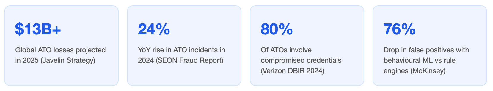 Account takeover (ATO) fraud has evolved from opportunistic credential stuffing into a sophisticated, AI-augmented enterprise. Legacy rule-based defences — IP blocklists, rate limiters, static device fingerprints are no longer enough. The threat actors of 2025 don't just steal passwords; they mimic legitimate user behaviour with startling precision. The question is no longer who logged in, it's how they logged in, and whether that behaviour matches the person who owns the account.